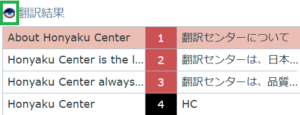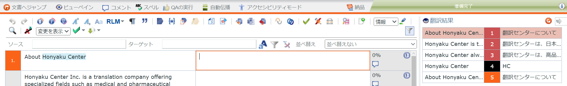 同時に、右の翻訳結果欄にそのセグメントの原文に対応する翻訳メモリ(以下TM)や用語ベース(以下TB)、機械翻訳(以下MT)が表示されます。