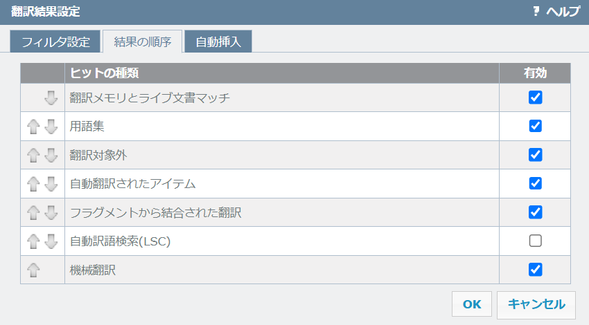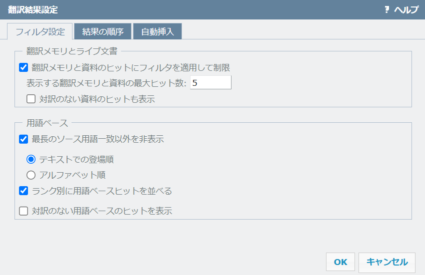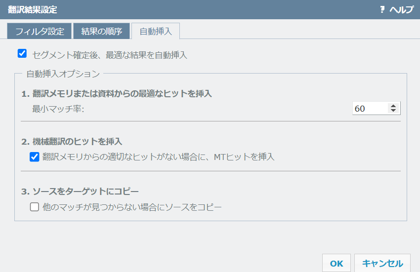 翻訳メモリの訳文欄への自動挿入の設定です。