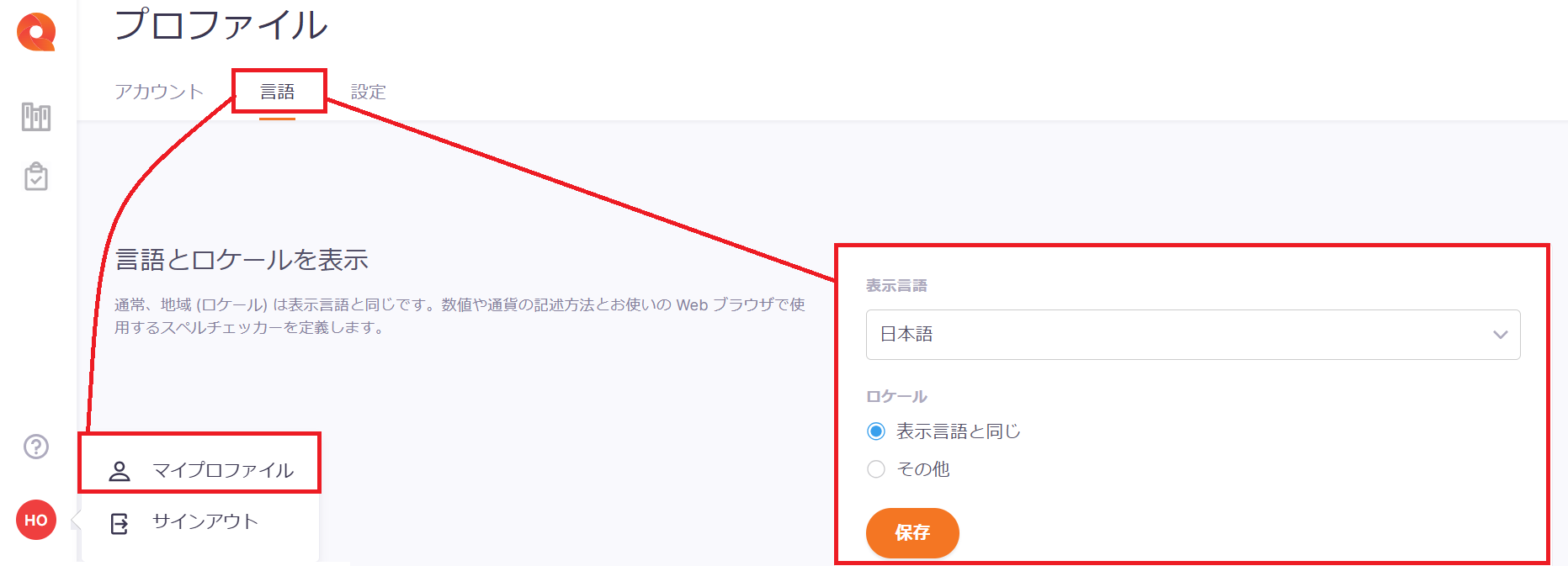 3) 「言語とロケールを表示」の「表示言語」でお好みの言語を選択して[保存]をクリックすると表示が切り替わります。