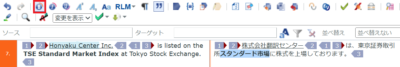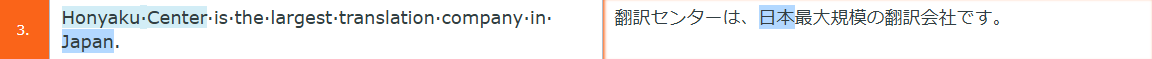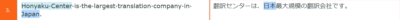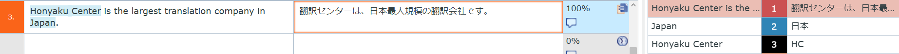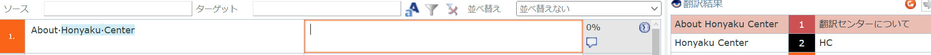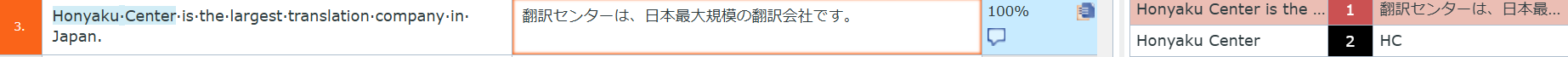 原文の「Honyaku Center」が青のハイライトで表示されています。青のハイライトはプロジェクトに設定してあるTBに用語が登録されていることを示します。