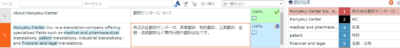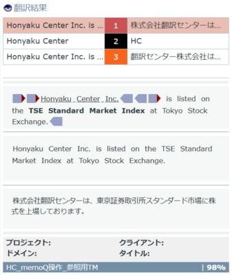 2) 右の翻訳結果欄には「Honyaku Center」が黒で表示されています。黒は禁止用語を意味します。この場合は「Honyaku Center」を「HC」と訳してはいけないことを示します。