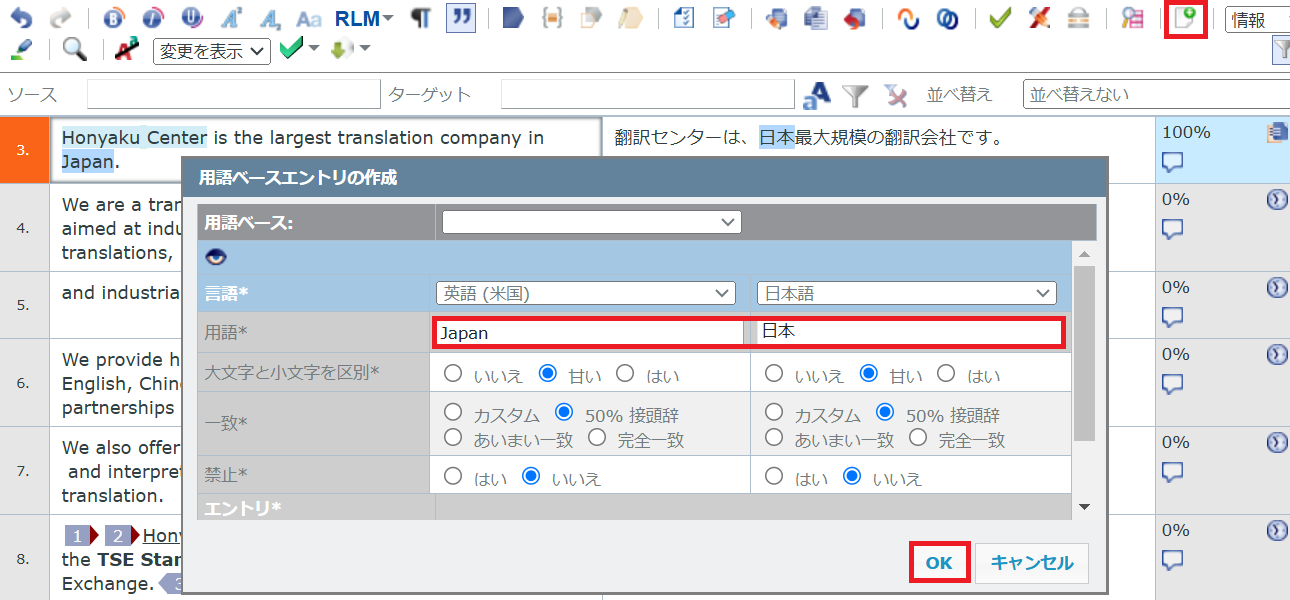 2) 作業中に用語を用語ベースに登録することができます。