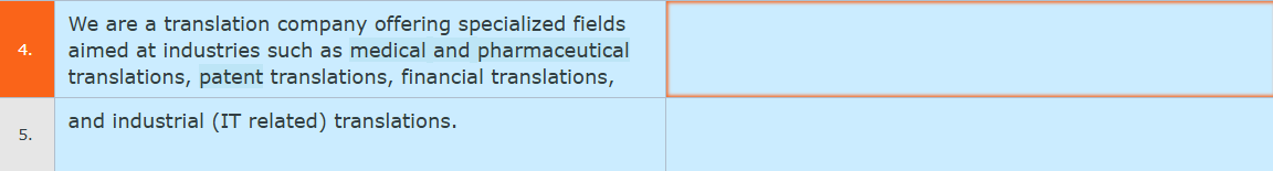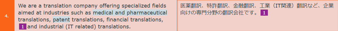 1) 原文に複数の青いハイライトが表示されています。翻訳結果欄に表示されている青の用語は指定訳語を意味しますので、原則として訳文に採用します。