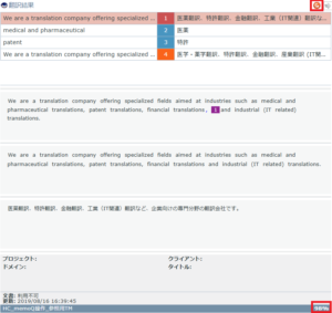 一致率は翻訳結果欄に表示されているそれぞれのデータをクリックすると右下に表示されます。
