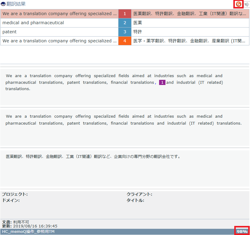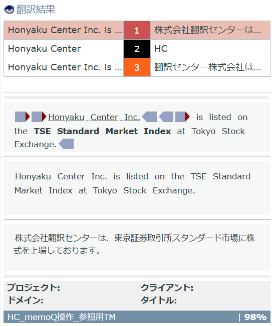 1) 98%のTMがあるので、原文とTMの相違点を確認します。