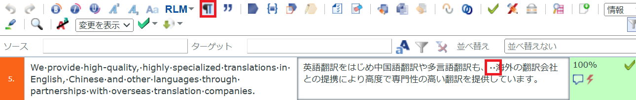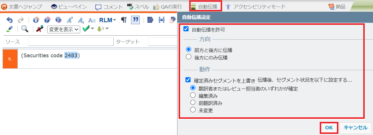 2) 翻訳を確定する際、原文が同じ他のセグメントにも訳文を反映する機能があります(自動伝播)。