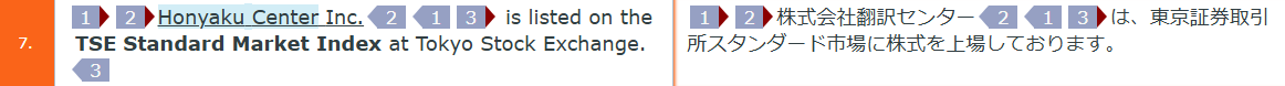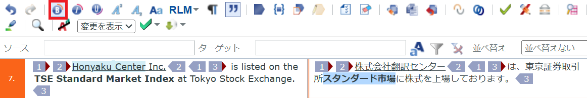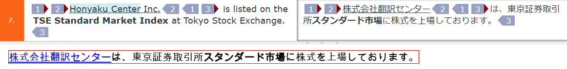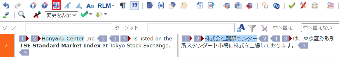 今回はタグが原文の「Honyaku Center Inc.」の前後と末尾にありますので、訳文で該当する「株式会社翻訳センター」の前後と末尾にそれぞれ同じタグを設定します。