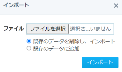 インポート時に [ 既存のデータを削除し、インポート ]  [ 既存のデータに追加 ] の2つの選択肢があります。