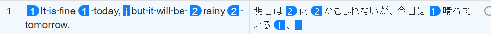 「It is fine today, but it will be rainy tomorrow.」を「明日は雨かもしれないが、今日は晴れている。」と訳す場合、英語と日本語では文が逆になっているので、分節結合後のタグも逆につけます。