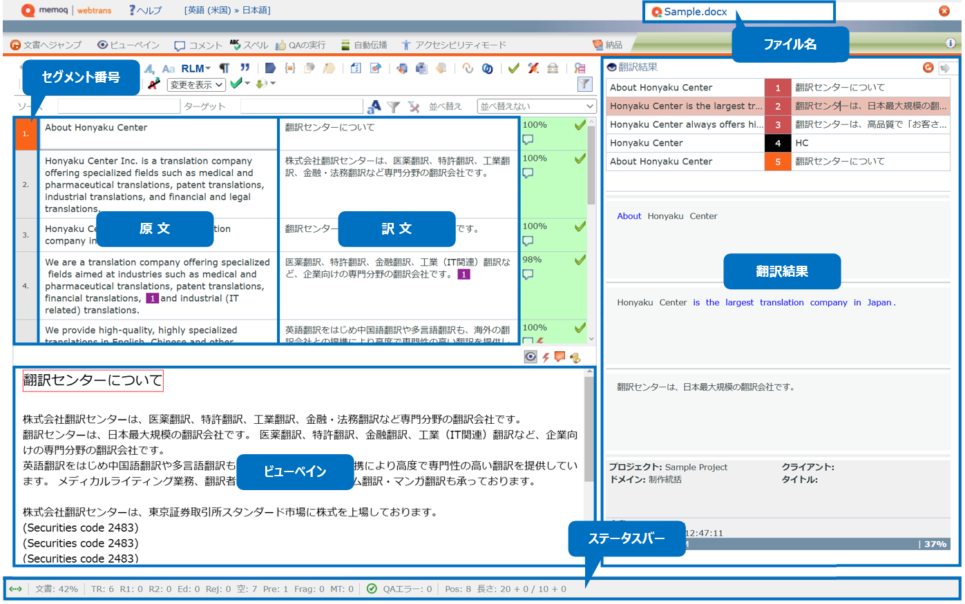 ファイルをクリックすると翻訳/校正を行うためのエディタが表示されます。