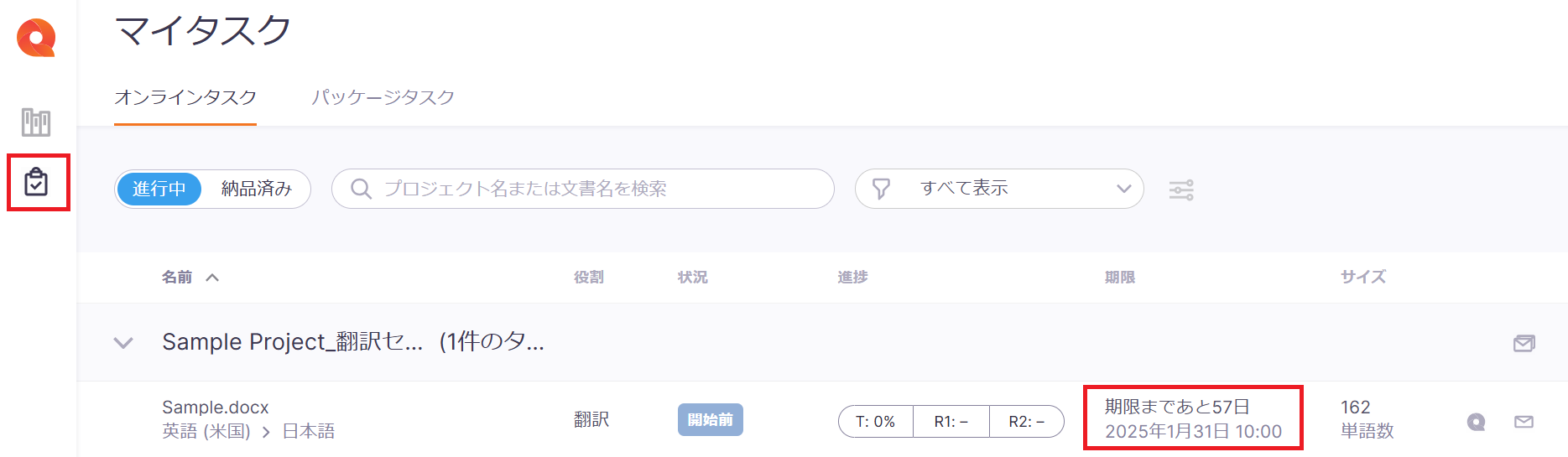 memoQにログインするとマイタスクに担当のプロジェクトが表示されます。