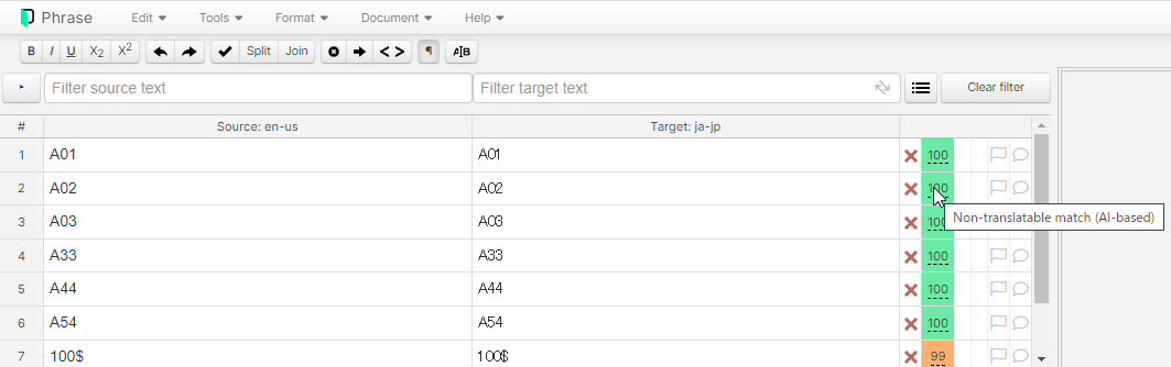 CAT欄の詳細についてはPhrase社公式ヘルプサイトをご確認ください。