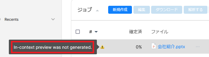 ⚠のマークにポインターを合わせた際に「 In-context preview was not generated.」という警告メッセージが表示されるファイルは、プレビュー機能が利用できません。