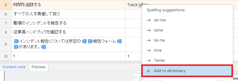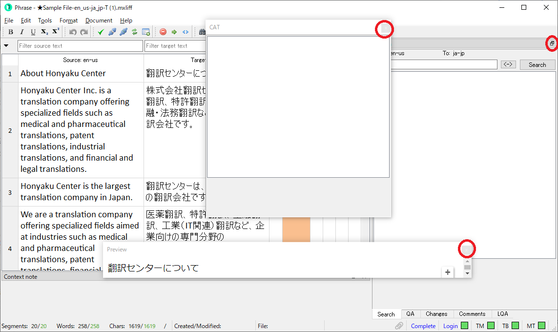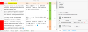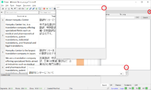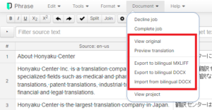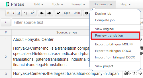 実際の翻訳結果を確認する場合は、エディターの上部のメニューにある[Document] > [Preview Translation] または[View original]をクリックして出力した翻訳ファイルまたはオリジナルファイルでの確認をお願いいたします。
