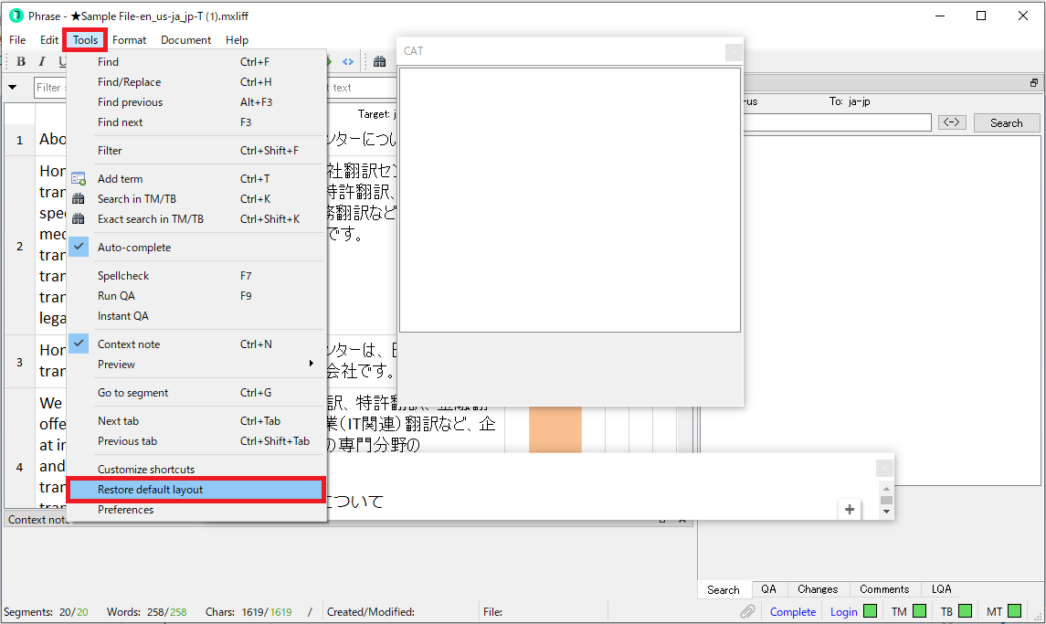 1. https://phrase.com/ja/download/よりCAT desktop editorの最新版をダウンロードし、Editorの設定を済ませてから再度MXLIFFファイルを開く。