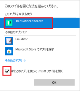 2. 最新版のEditorでもうまくいかない場合は、MXLIFFファイルをダウンロードした後、右クリックで「このファイルを開く方法を選んでください」という画面を表示させてください。「TranslationEditor.exe」というCAT desktop editorのアイコンのアプリケーションを選択し、「常にこのアプリを使って.mxliffファイルを開く」にチェックを入れてから[OK]をクリックしてください。
