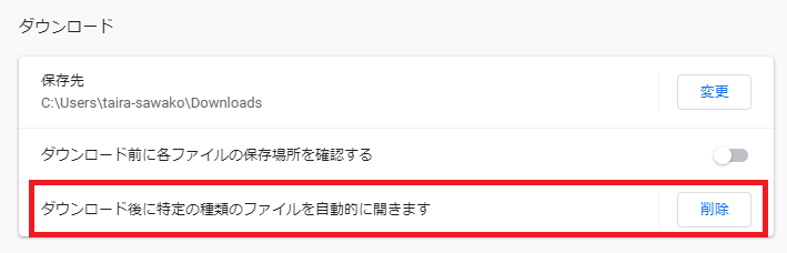 - 「ダウンロード」項の「ダウンロード後に特定の種類のファイルを自動的に開きます」の横にある「削除」を押す