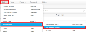 下記のようにエディターのメニューからEdit > Insert symbol > Non-breaking hyphenの順に選択して挿入してください。