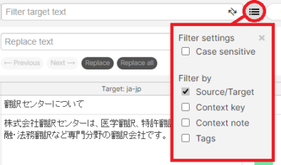 なお、検索置換の際に大文字小文字の区別等の条件を設定したい場合は、フィルターの隣にあるFilter settingsをクリックして、希望の条件を設定してください。