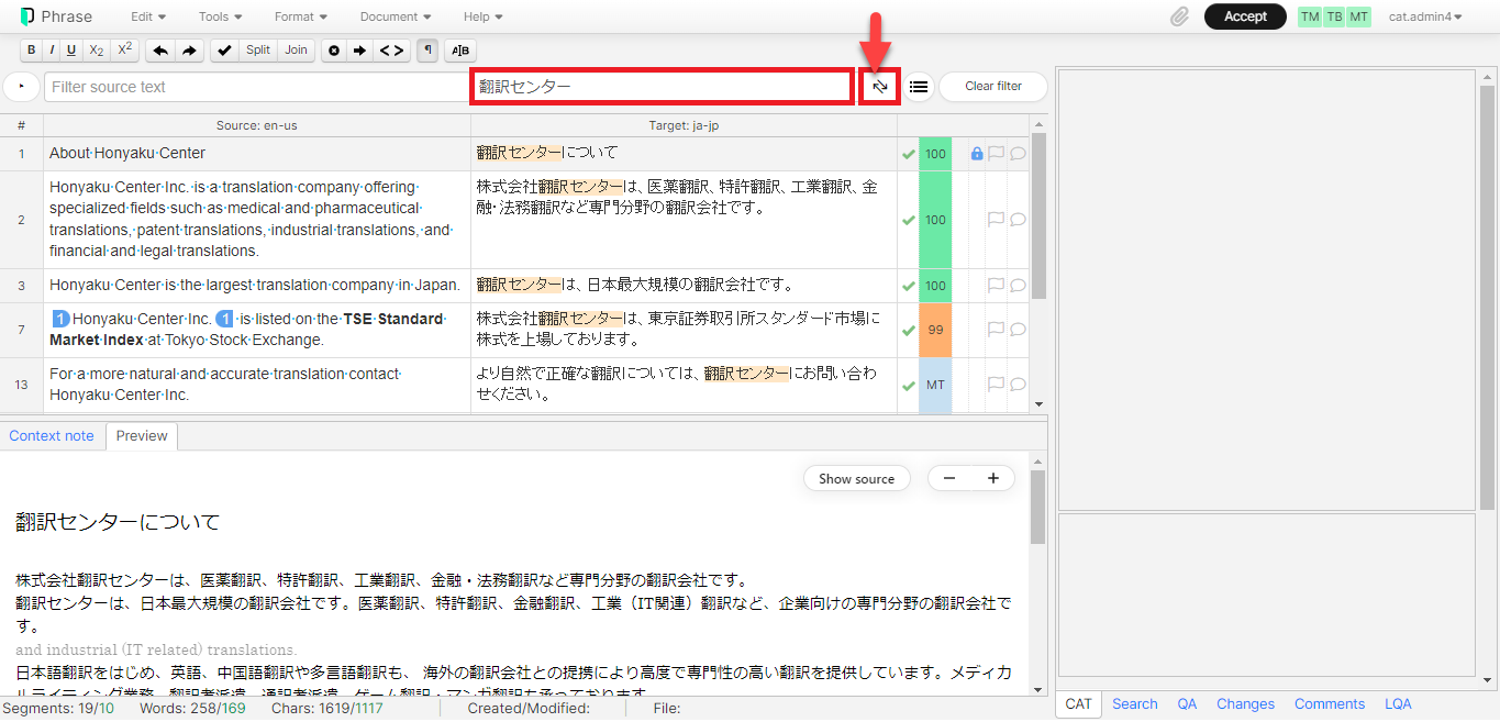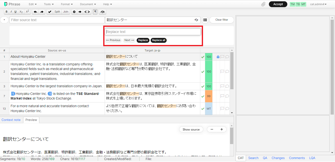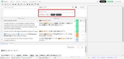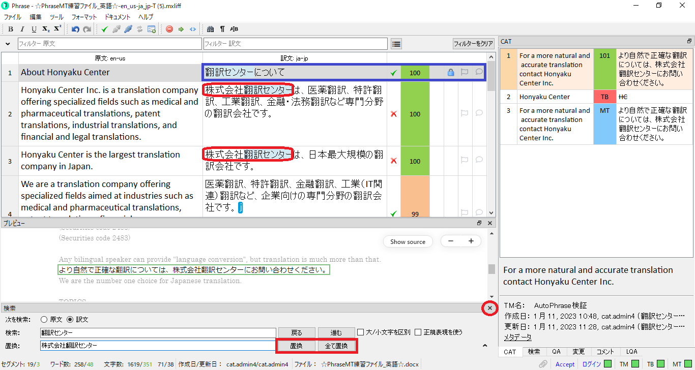 「Replace」または「Replace All」をクリックしてください。ロックされているセグメントを除き指定の文字列が置換されます。