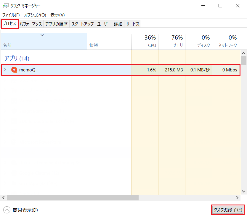 3. [プロセス]タブに切り替えて「memoQ.exe」を選択し、[プロセスの終了]をクリックして終了させます。