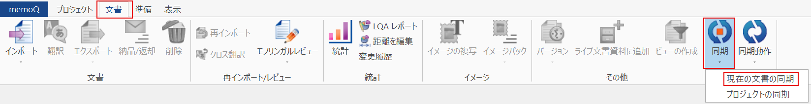 [文書]タブの「同期」の▼から「現在の文章の同期」をクリックし、作業中のファイルをサーバーと同期させます。