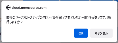 3) レビューなど後工程が設定されている場合は、「最後のワークフローステップの同ファイルが完了されていない可能性があります。続行しますか?」と表示されますが、[OK]をクリックして進めてください。