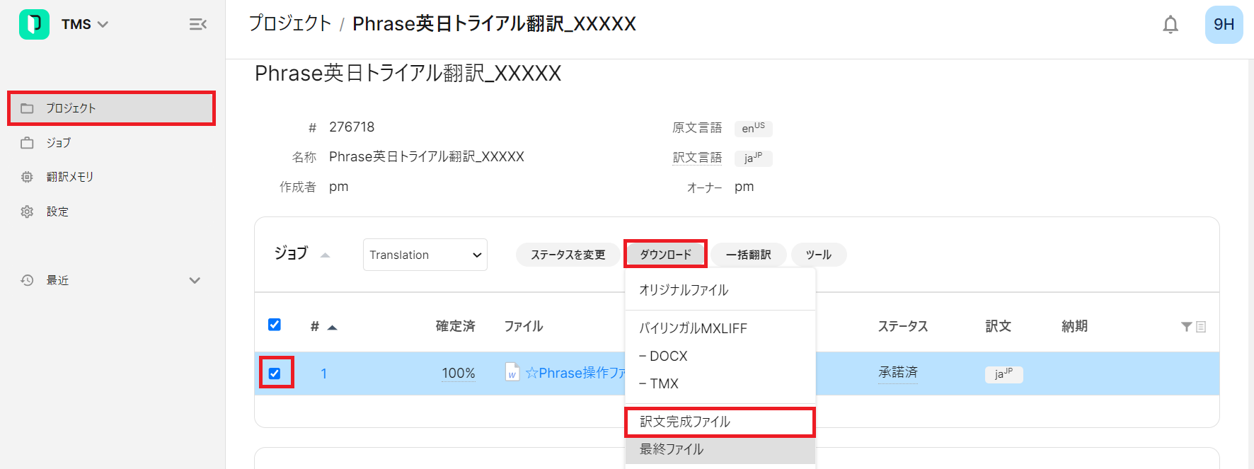 2) プロジェクト画面が表示されたらジョブの左のチェックボックスにチェックを入れてファイルを選択してから、[ダウンロード]-[訳文完成ファイル]をクリックします。