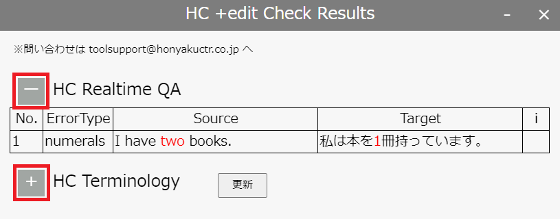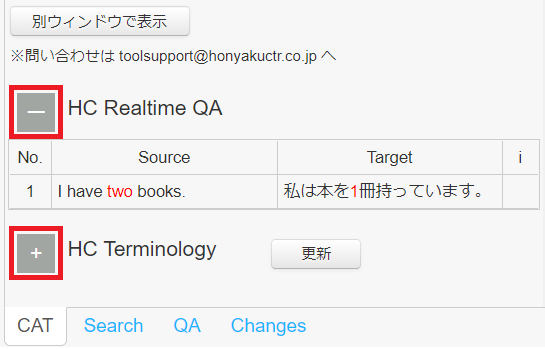 HC Realtime QA、HC Terminologyの左の[-]をクリックすると折りたたまれ、[+]をクリックすると展開して表示されます。