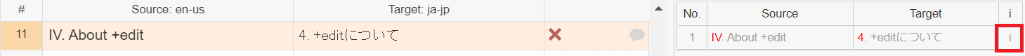 ※ ignoreしたセグメントの再編集を始めた場合は、ignore「i」がクリアされ、訳文は再チェックされます。