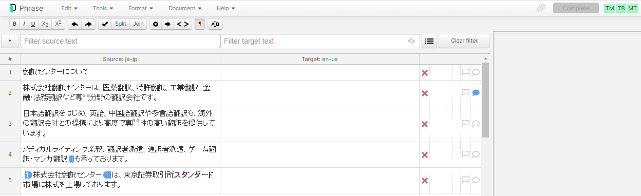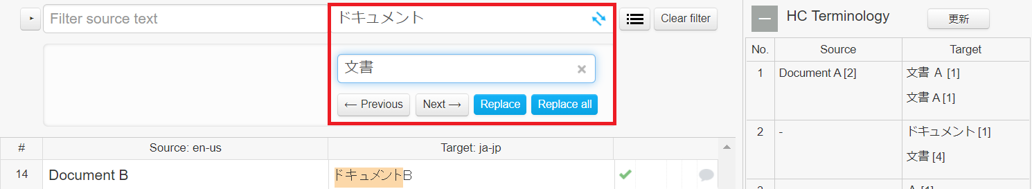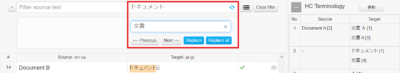 表記の統一が必要な場合は、エディター上部の検索・置換などを利用して訳文を編集してください。