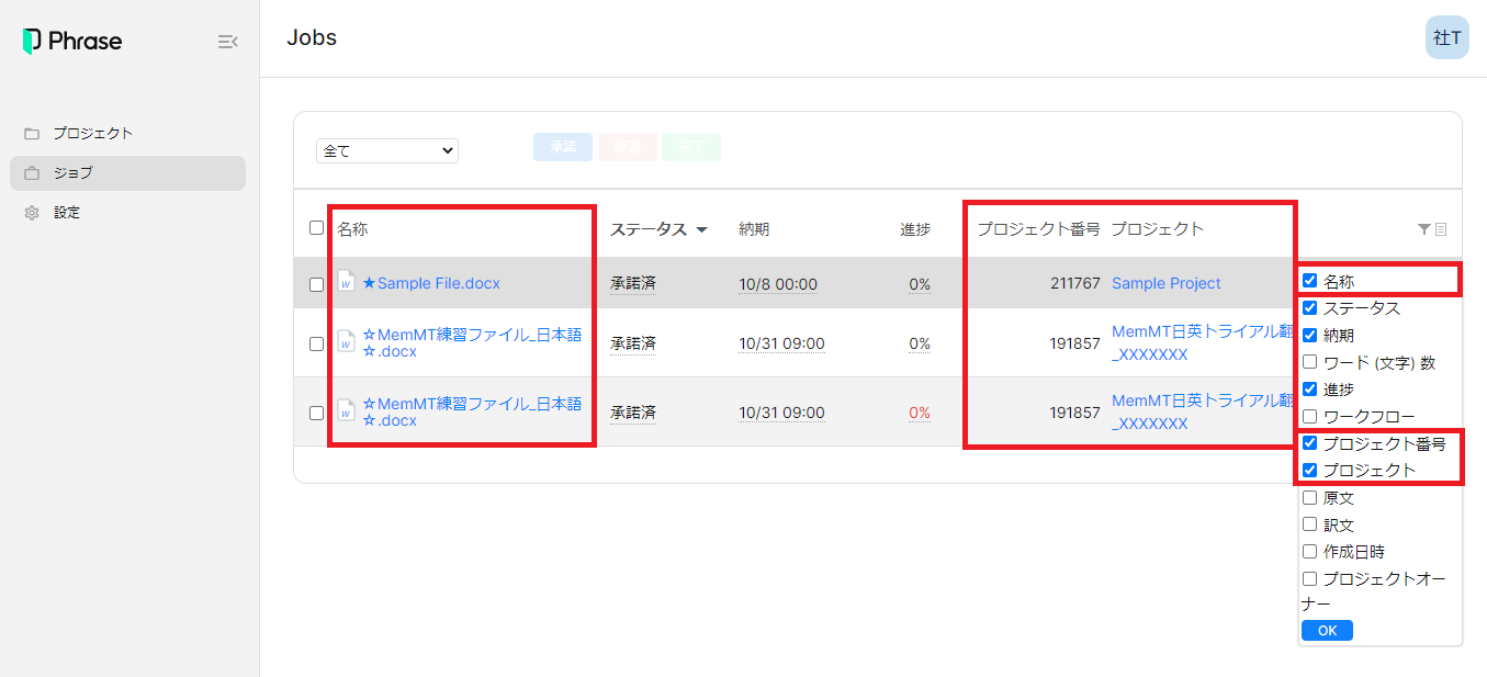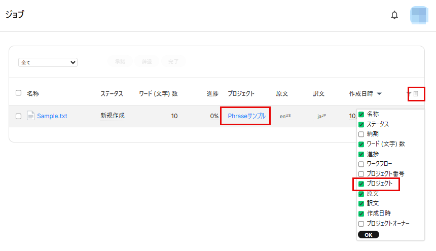 プロジェクト名が表示されていない場合は、ジョブ一覧の枠の右上のアイコンをクリックし、[表示項目を編集]をクリックすると項目が表示されますので、[プロジェクト]にチェックを入れて[OK]をクリックして表示してください。