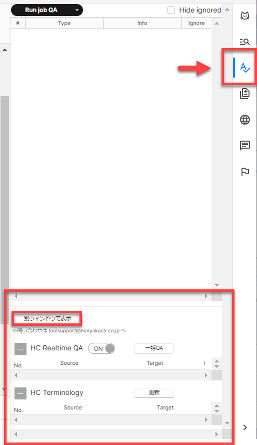 訳文には問題がなくHC realtime QAの指摘が適当でない場合は、各指摘それぞれの右端の枠(ignore枠)をクリックしてください(図の赤枠部分、クリックするまでは空欄です)。