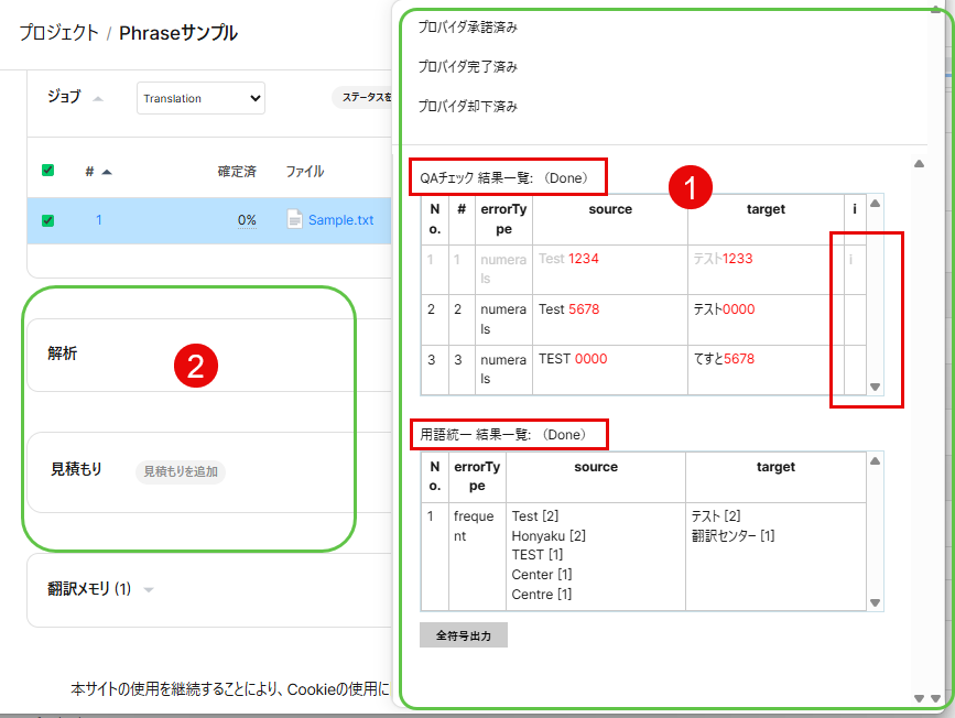 3) ステータスの変更画面の下部①にQAチェック結果一覧と用語統一結果一覧が表示されます。