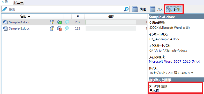 2) 任意の文書を選択して[詳細]をクリックし、「ターゲット言語」を確認します。