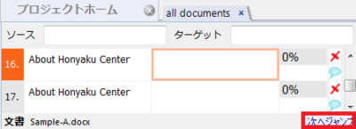 1) 訳文欄に翻訳メモリやMTから訳文を反映します。処理したい文書をクリックして反転させます。