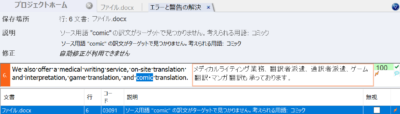 訳文を編集する場合はこの画面で直接編集するか、下部の説明部分をダブルクリックして文書タブの該当箇所にジャンプして編集します。