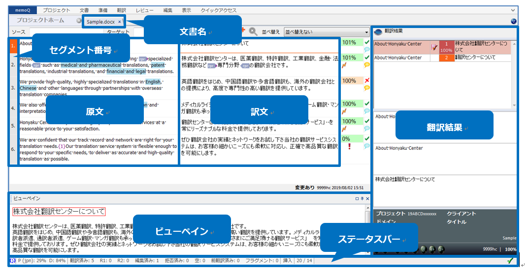 • 翻訳結果 : 翻訳メモリや用語ベースなど、設定されている情報の自動検索結果が表示されます。