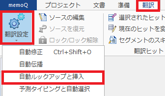 1) [翻訳]タブの[翻訳設定]を開き、[自動ルックアップと挿入]をクリックします。