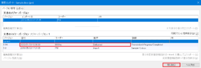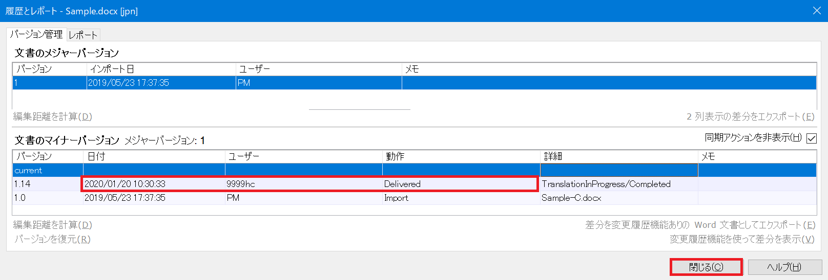 5) [文書のマイナーバージョン]の動作「Delivered」の行に表示された納品日時を確認します。