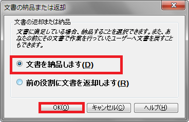 2) 校正の場合は選択画面が表示されますので、「文書を納品します」を選択して[OK]をクリックします。もし誤って「前の役割に文書を返却します」を選択して[OK]をクリックしてしまった場合は、早急にプロジェクト管理者へご連絡ください。