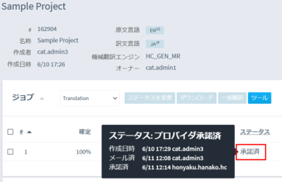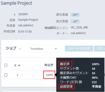担当ジョブの進行状況は、プロジェクト画面の該当ジョブにある [ 確定済 (Confirmed) ] 項目の、%にマウスポイントを合わせるとポップアップ表示で確認できます。