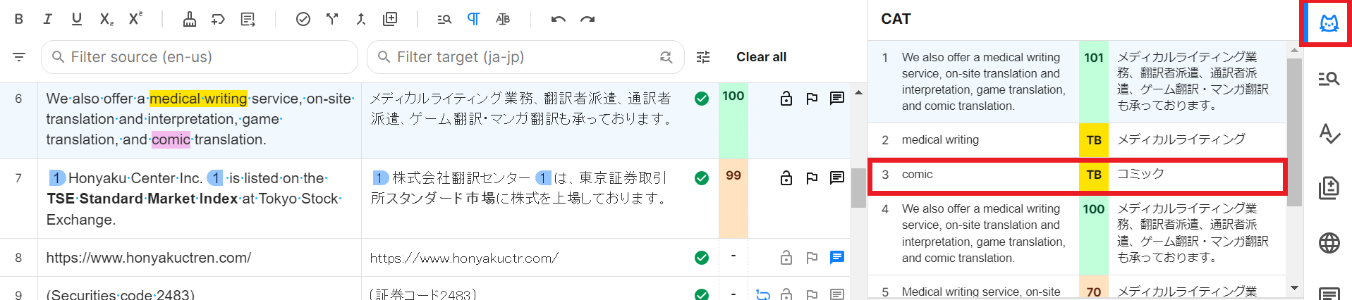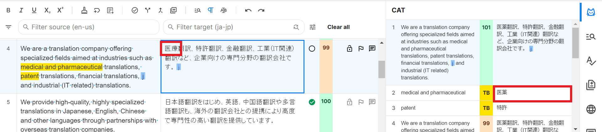 このセグメントはTMとTBで訳語が異なったセグメントですが、今回はTMを優先させたので訳文は問題ありません。