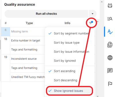 [QA]アイコンをクリックしてQA欄に戻り、警告の右端の目のマークをクリックすると、目に斜線が入り警告の文字が薄灰色に変わります。