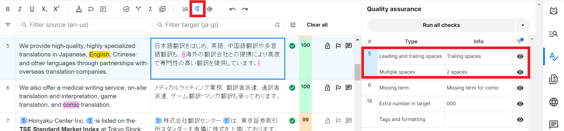 3) セグメント5に警告が2つ表示されています。訳文に余分なスペースがあるという警告です。エディター上部の [¶] をクリックすると、スペース等の編集記号の表示/非表示を切り替えて確認できます。訳文を適切に修正して確定してください。