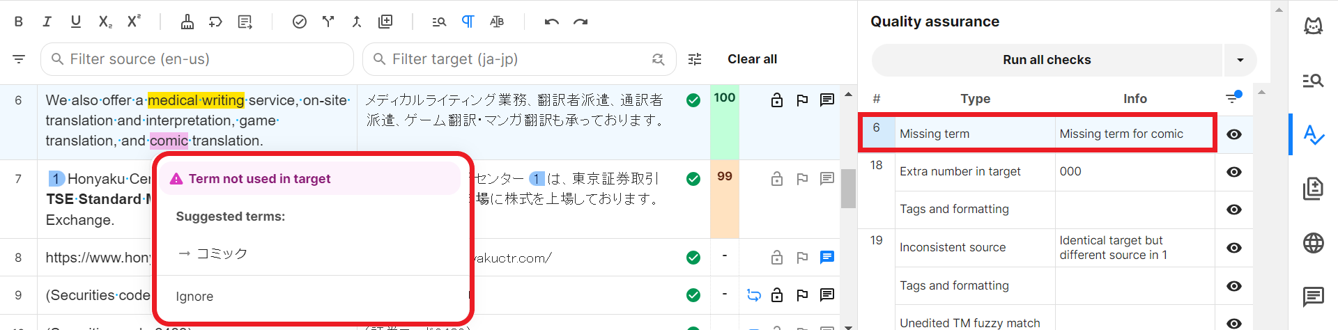 4) セグメント6に警告が1つ表示されています。Terminologyの警告は、TBで指定されている訳語が訳文にないという警告です。
