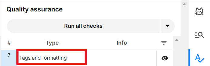 ただし「Tags and Formatting」の警告が検出され、原文の青いタグを訳文に反映していなかった場合は、決して無視せず訳文に適切にタグを設定してください(原文改行を入れた箇所の「Tags and Formatting」の警告は例外的に無視していただいてかまいません)。