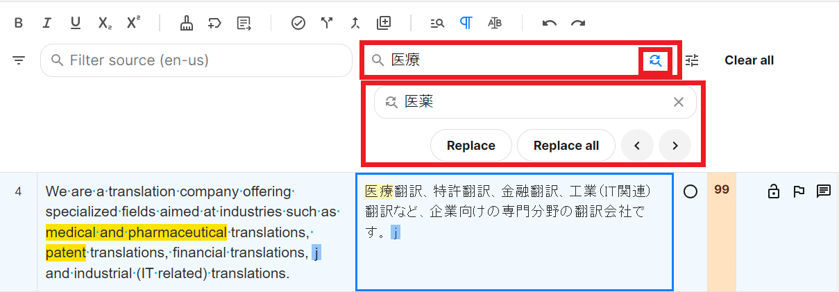 ※ 訳文欄の用語を一括検索・置換したい場合は、エディター上部の訳文検索ボックスに検索する文字列を入力して検索してください。置換したい場合は訳文検索ボックスの右の