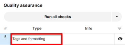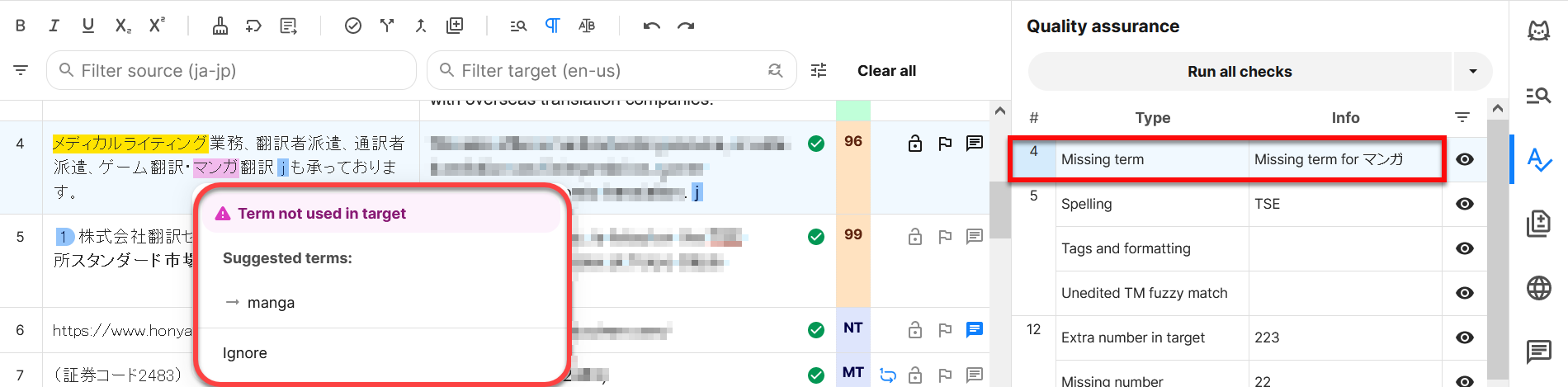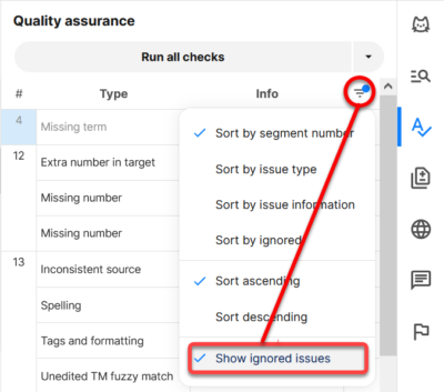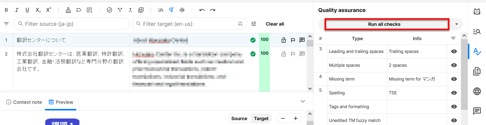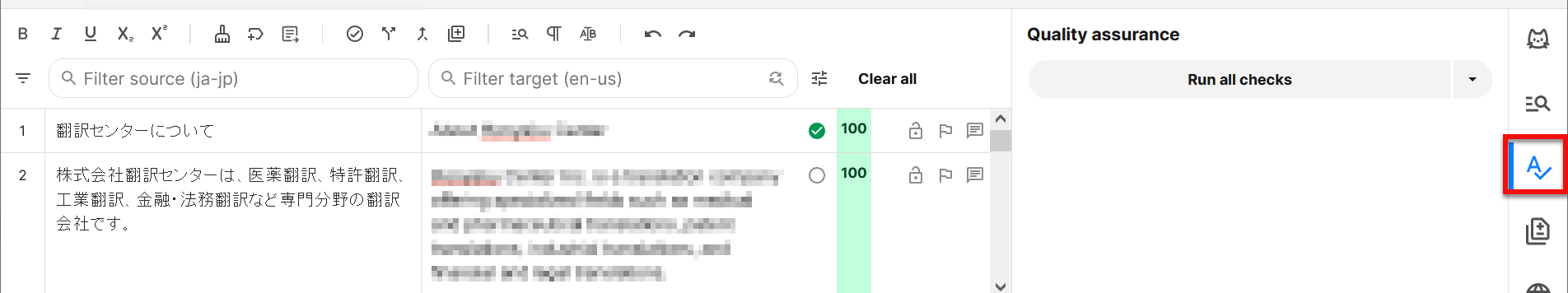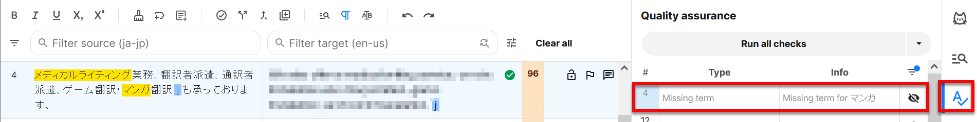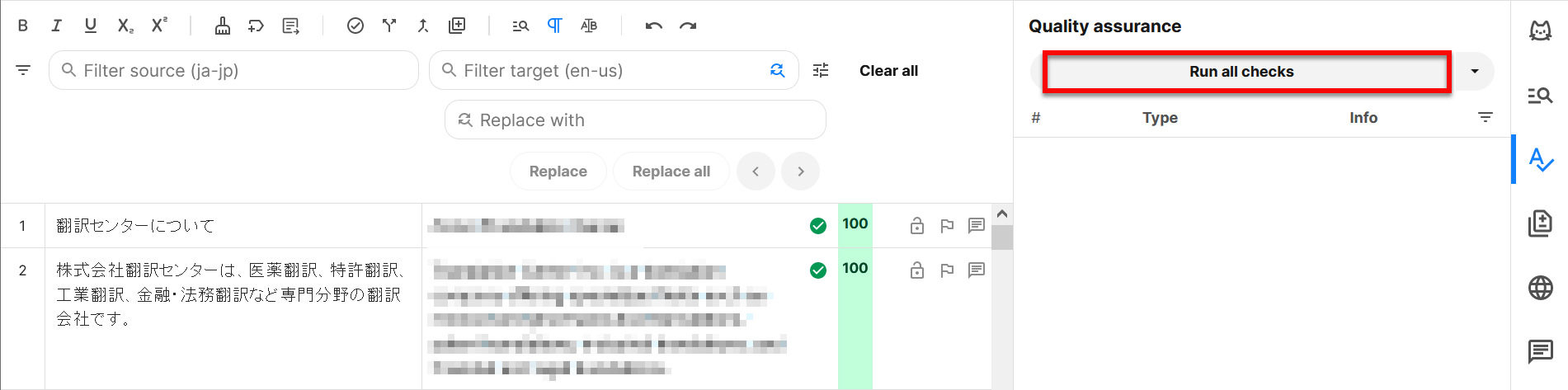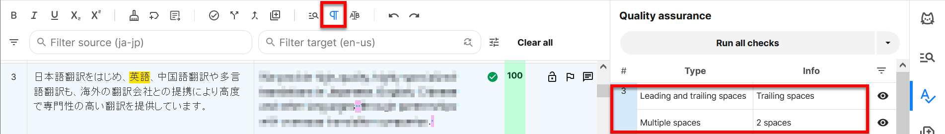 2) QA欄上部の[Run all checks]をクリックすると、QAチェックが開始されます。警告がある場合はQA欄に一覧表示され、クリックするとカーソルが該当のセグメントにジャンプします。