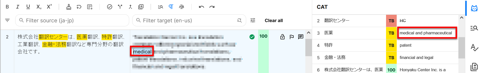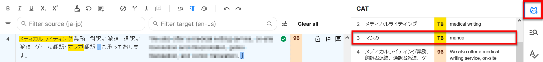 ※ 訳文をCAT欄に表示されているTBの指定訳語に差し替えたい場合は、訳文の該当箇所を範囲選択してからCAT欄の訳語をダブルクリックします。